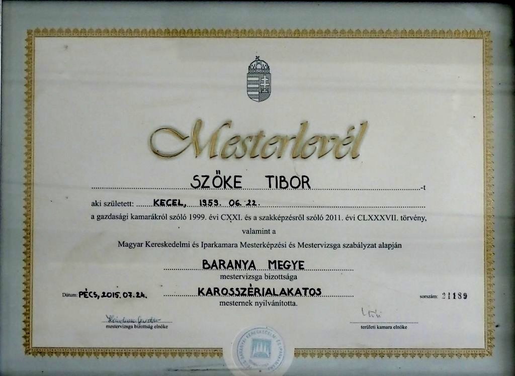 Szőke Tibor szakmai tudását a 2015-ben megszezett MESTERLEVÉL igazolja, mely szerint a Magyar Kereskedelmi és Iparkamara KAROSSZÉRIALAKATOS MESTERNEK nyilvánította.